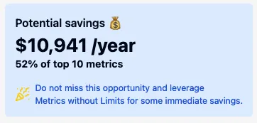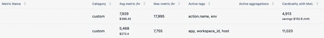 Finally, we estimate the new cardinality after applying the Metrics without Limits feature, which in this case is 4,913. In our case, we can save 7,929 - 4,913 of cardinality for this metric which would have an impact of $150.8/month.