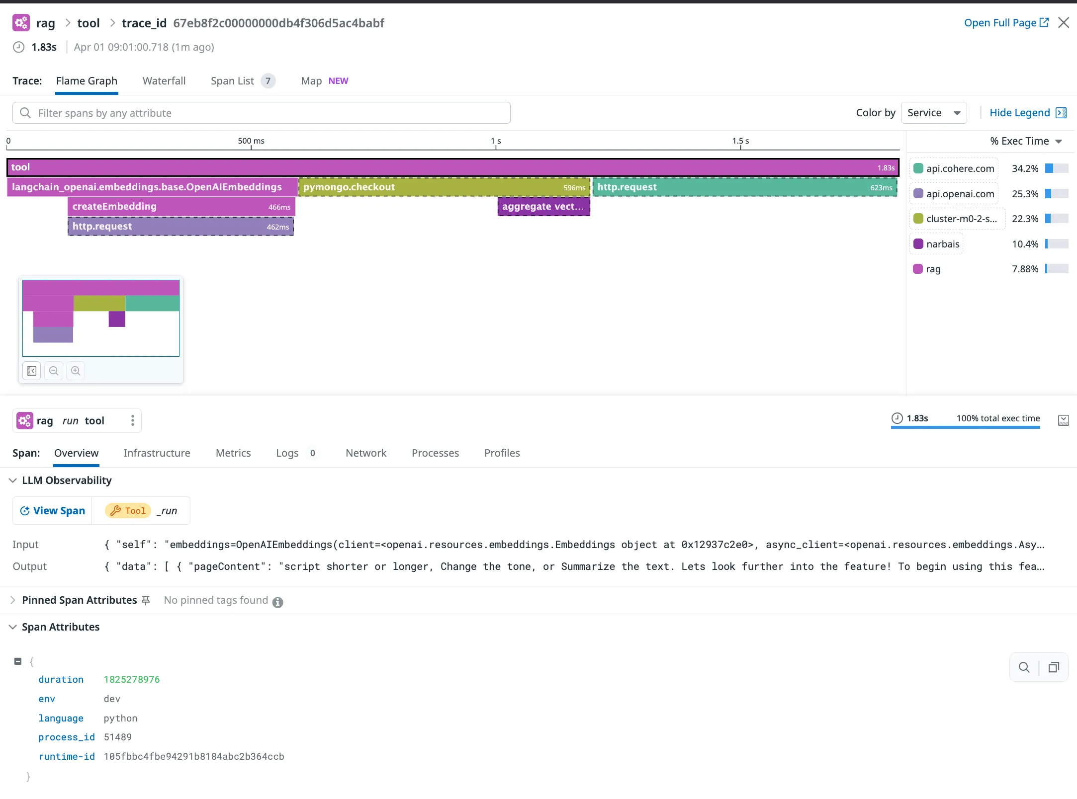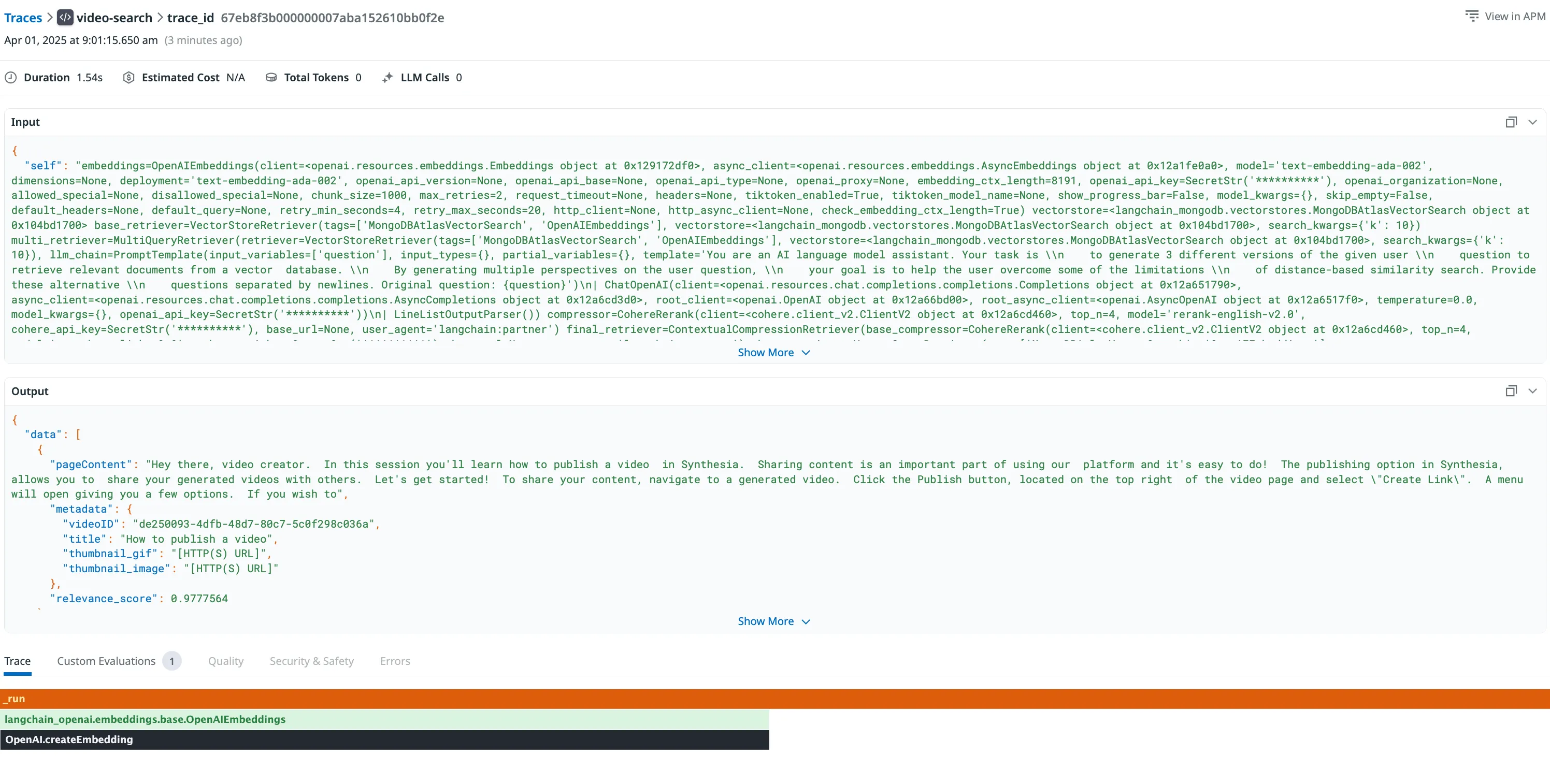 Datadog Trace of our RAG Video Retrieving Chain