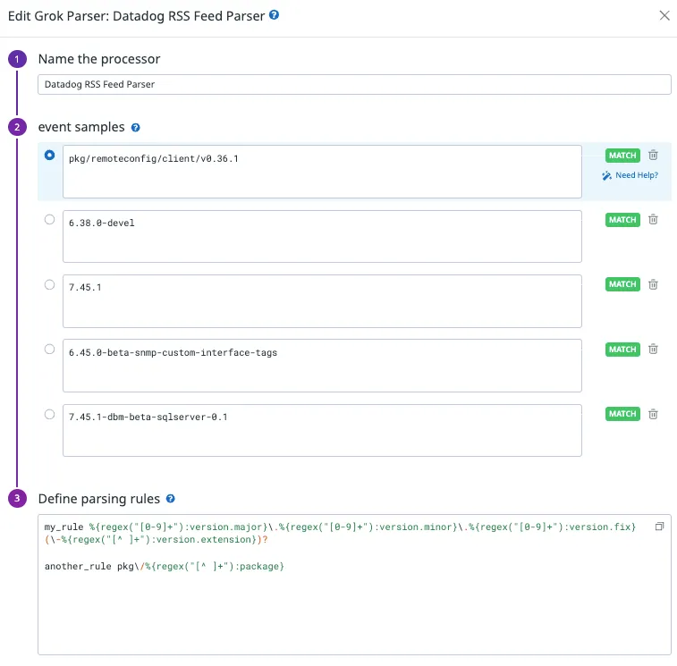 - Step 2: Implement a grok processor to effectively parse the message content and extract the new version number. Below is the grok parsing rule utilized. These rules will extract both the version numbers and their extensions.