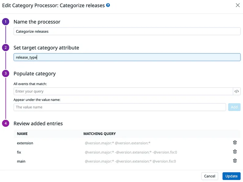 - Step 3 (optional): Employ a category processor to discern whether the version is minor, major, or an extension. Refer below for each category. (Side note: category processors are often under utilized but are very powerful to organize the incoming data.)