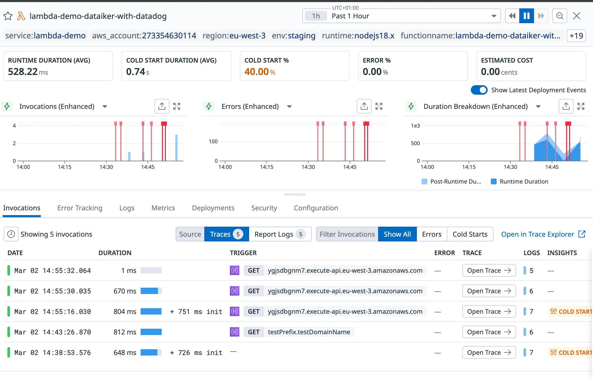 In addition, while diving in the lambda-demo-dataiker-with-datadog function, we can start to observe a more comprehensive view.
